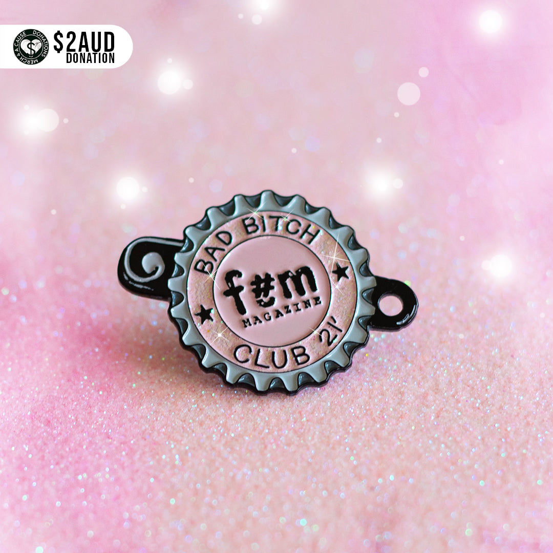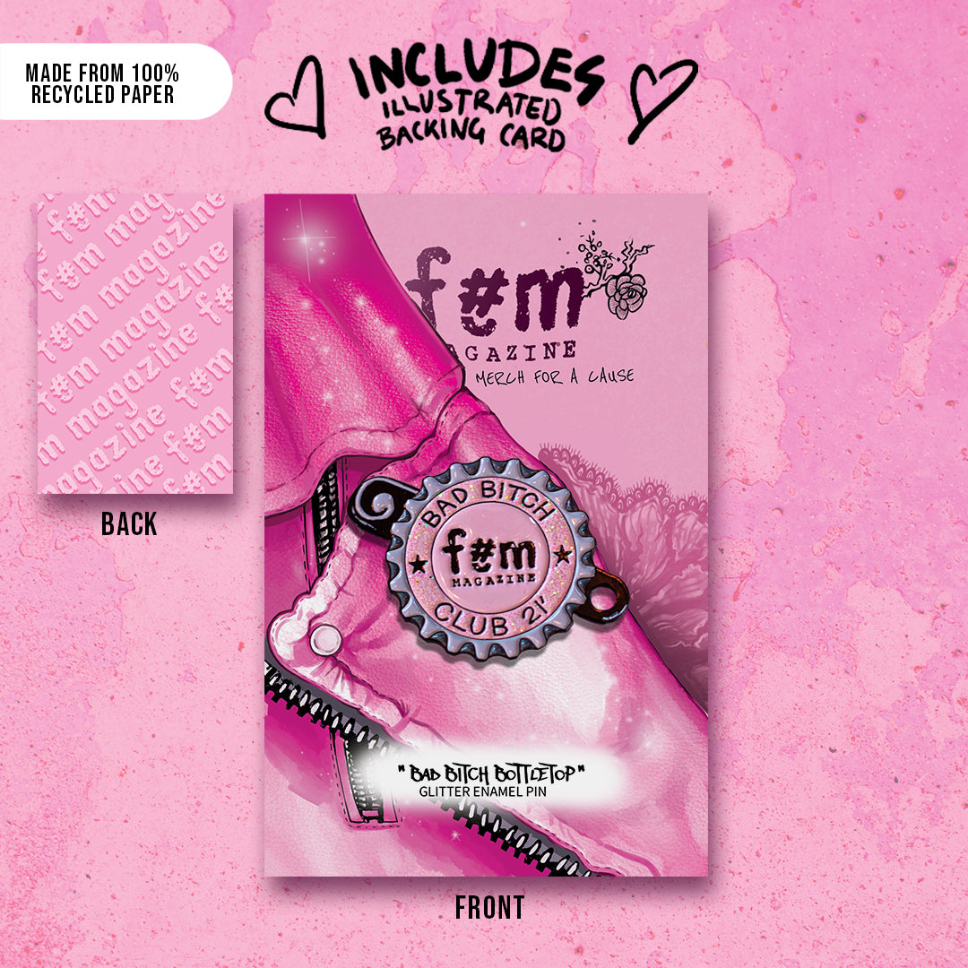 Our 'B.B.B' pin celebrates with a real durable token of our historic first ever issue!! These specialty glittering stunners are drawing on that old school DIY punk days of bottle top pins, social activism and underground hear-me-roar grrrl bands. Get ready to rally your own march of confidence and challenge that pink/sparkles mean delicate, not a badass strength in its own form. Everyone’s welcome at the Bad Bitch Club.