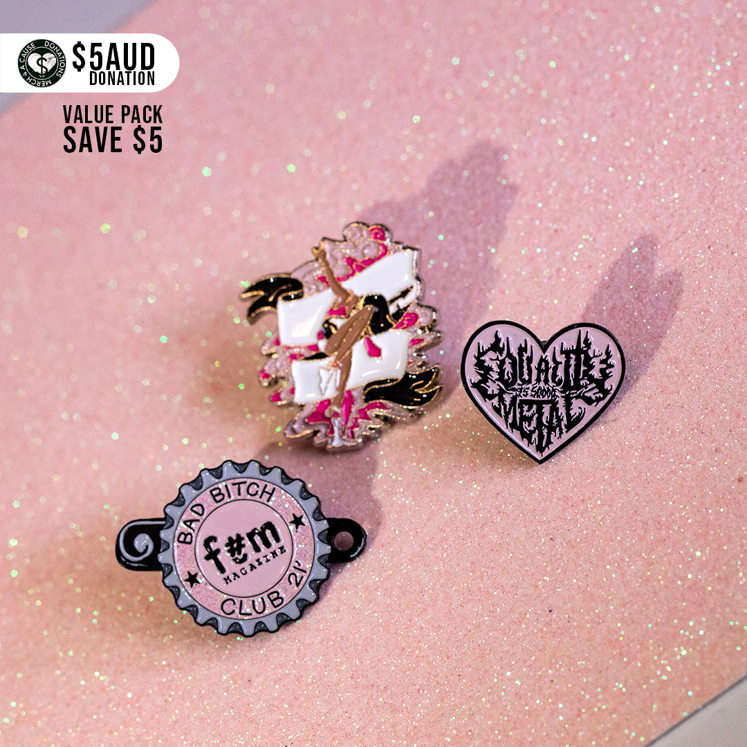 This pin pack is a part of our line ‘Merch 4 a Cause’. All items are designed by us to feel empowering to the wearer, show a physical token of support in the community we want to build with each other AND ACTUALLY does something to back the cause. While the current pandemic has caused a struggling scenario where many musicians are forced to throw in the towel, the change we hope to see by having more equal representation is thwarted as unsupported minorities are the first to have to sacrifice their dreams. This includes women, POC and the LGBTQ+ community. A portion of proceeds from each item purchased in our merch line goes directly towards supporting the bands/artists represented in our magazine, so they can feel the support and community to keep on making your new favourite music! We thank you for your contributions! Read more here.