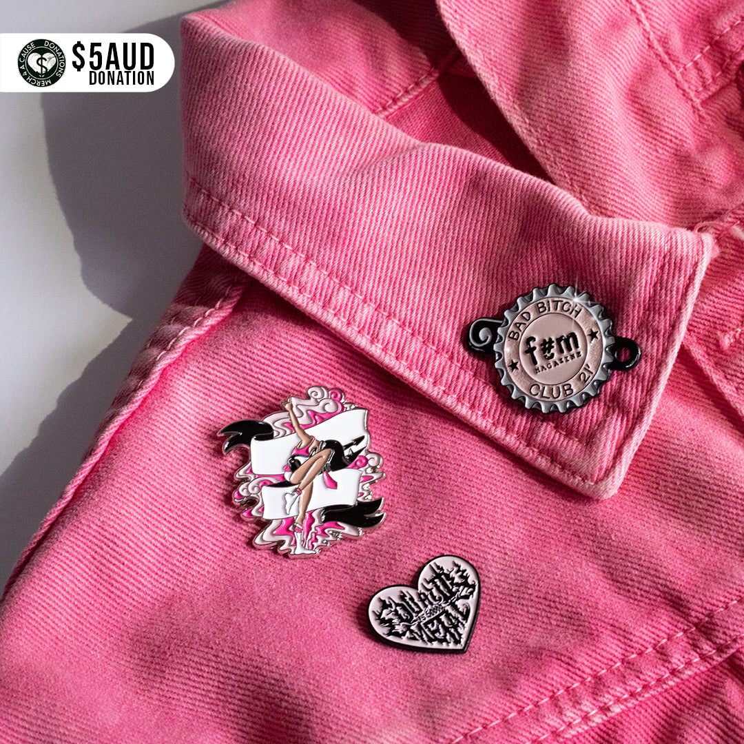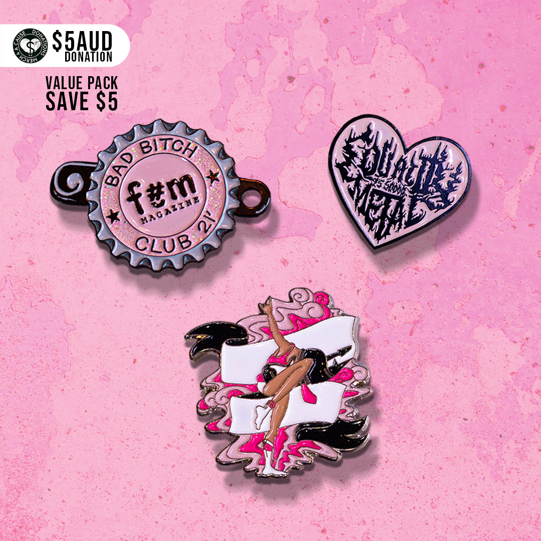 This item donates $5AUD to the nominated artists featured in f#m magazine, Issue 1 for each pin pack purchased. Click here to read more.