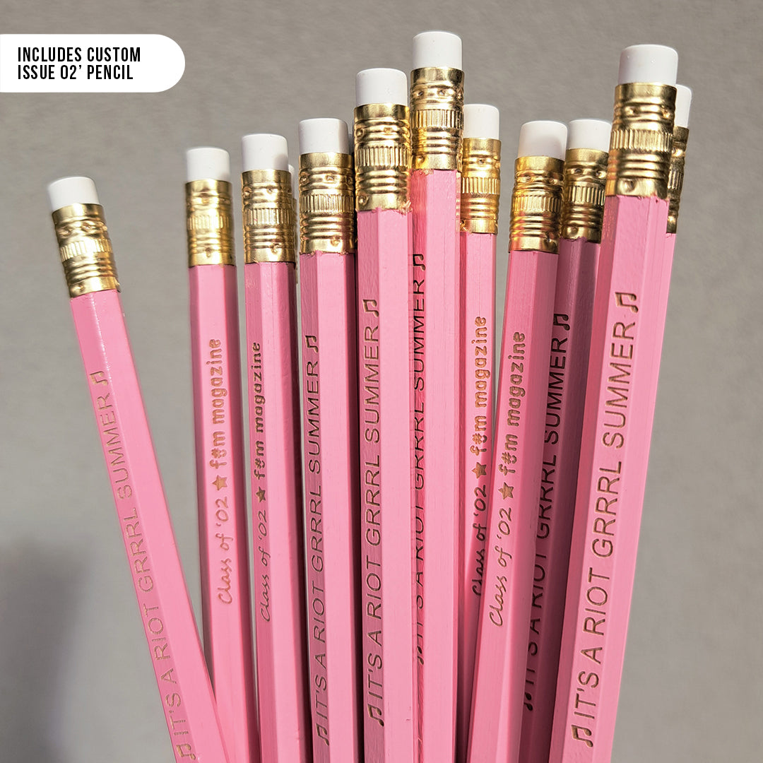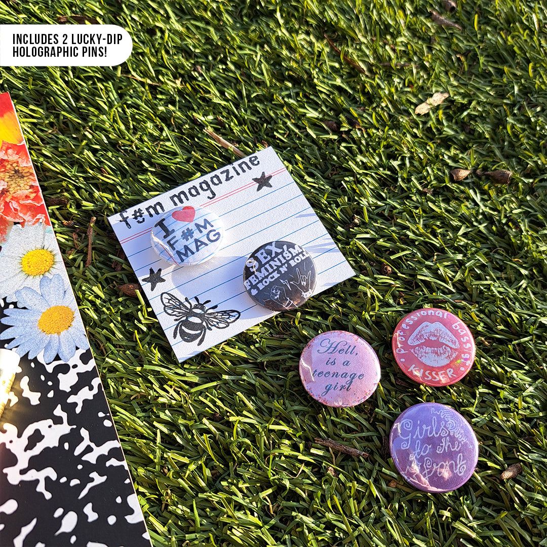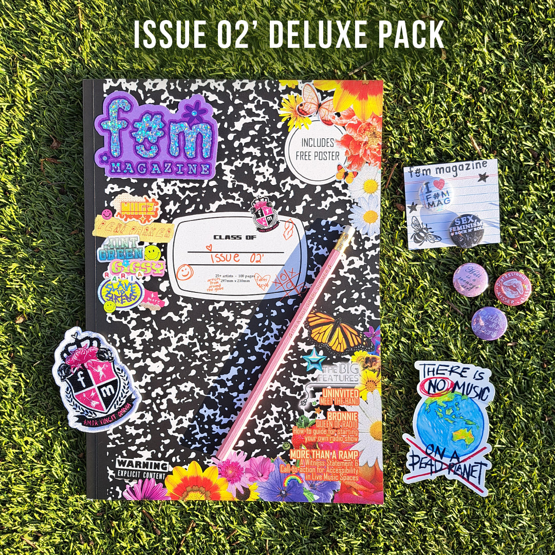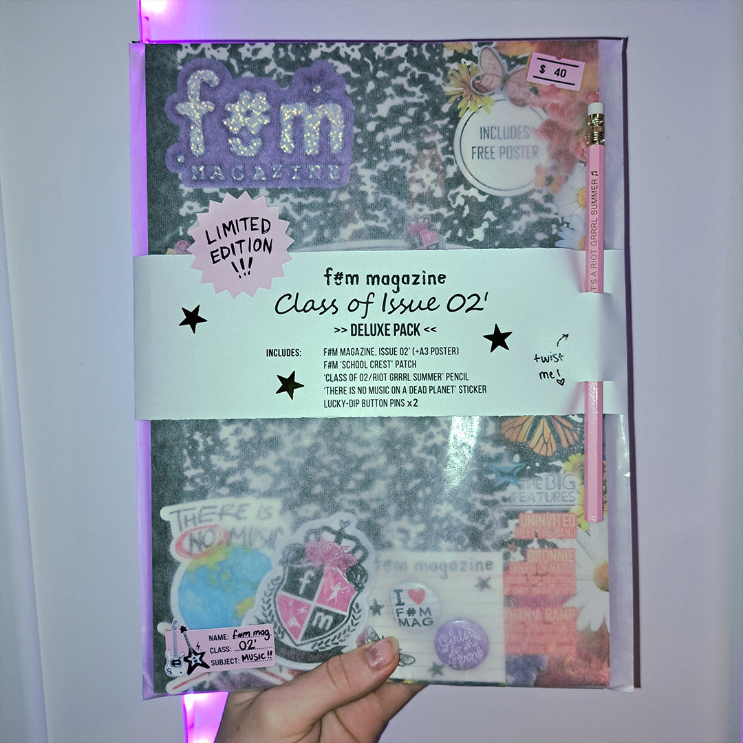 The Deluxe Pack contains all sorts of extra goodies to go with your magazine, including a F#m magazine 'School Crest' patch, a 'Class of 02/Riot Grrrl Summer' pencil, 'There is No Music on a Dead Planet' sticker, and two lucky-dip button pins!